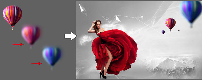 7、将三角体链接线进行修饰,然后复制热气球图层,将其中一个气球进行镜头模糊滤镜命令,并调整颜色。