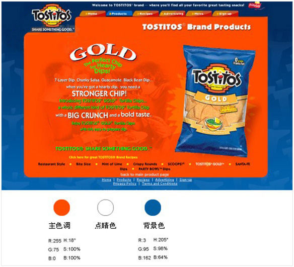 这组橙色蓝色对比色在网页上比其他两组对比色红色绿色,黄色紫色应用得多,能迅速的传达网站主题内容、网页主体,容易增添强烈的兴奋度,多用于食品、休闲娱乐、产品等,但却又是跨越于各行业的主题网站,适用的范围非常大。