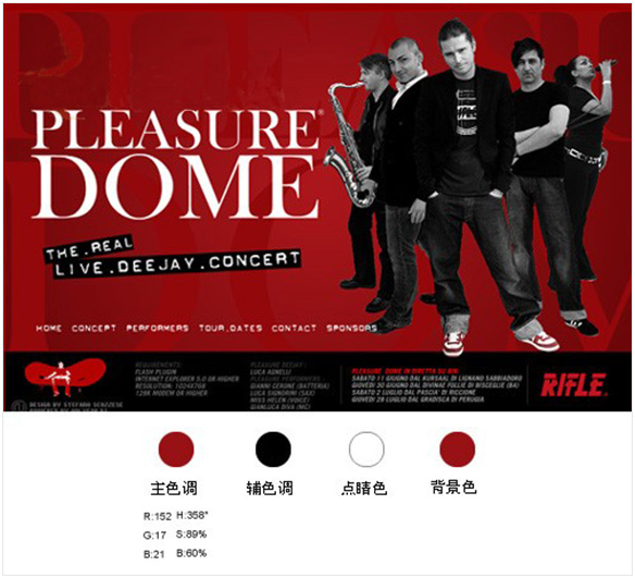 这组配色中,红色是降低了明度的深红色,为主色调和背景色的大面积使用。红黑搭配色,常用于较前卫时尚、娱乐休闲、电子商务等等要求个性的网页设计配色里,也又有用于部分政治、新闻的页面。