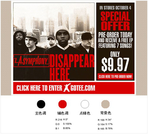 这里颜色位置的摆放,起到平衡页面视觉,突出主题效果。背景色加了渐变效果、整体与前景人物黑色对比呈浅色,前景人物黑色与背景深红色、背景深红与前景白色文字相互之间的关系,构成空间环境的视觉效果。
