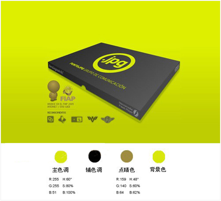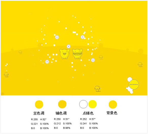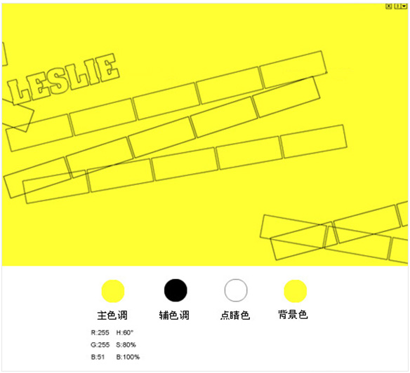 从HSB数值上看,该中黄色的明度和饱和度呈最高值,属于明亮耀眼的颜色。辅助色是黄绿色和红色,黄绿色在中黄背景下呈冷色调,轻快单薄的亮色;红色的HSB数值H色相上看是正红色,明度稍低,这里属于厚重沉稳的颜色,在中黄色背景下呈现暖色调;背景中黄色在黄绿色和红色两者中这时呈中间色,是很好的整体页面视觉过渡色。