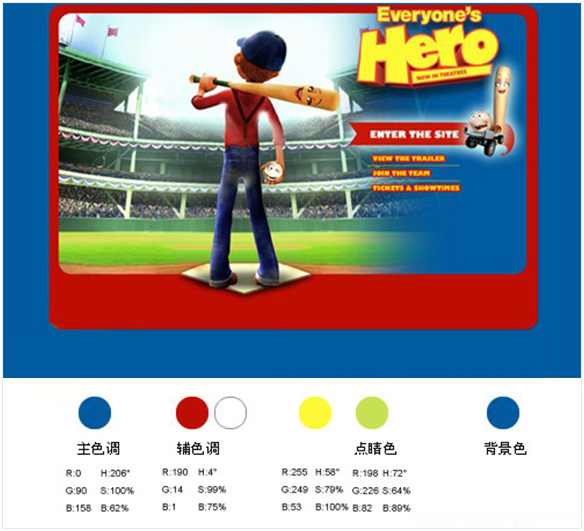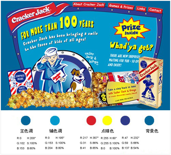 该页面设计师选取了页面的产品图片中的两三种颜色,例如点睛色里的红色、蓝色和黄色,再大胆的发挥出主色调蓝色、较浅的辅色调蓝色和点睛色正黄色,点睛色黄色运用于最能突出产品特色的文字上,这些和谐的元素生动趣味,让整个页面充满了故事情节。